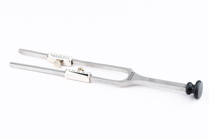 The original design Rydel Seiffer 64/128 Hz graduated tuning fork. End weights convert the tuning fork from 128 to 64 Hz. The weights have been scaled allowing reliable quantitative vibratory testing. As the intensity of the vibration starts to diminish the two triangles move closer together again and their point of intersection moves slowly upwards. The intensity at which the patient no longer detects the vibration is read as the number adjacent to the intersection of the triangles.