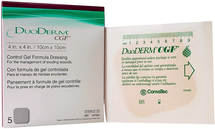 DuoDERM® CGF Dressing is a hydrocolloid, moisture-retentive wound dressing used for partial and full-thickness wounds with exudate. It incorporates a unique ConvaTec hydrocolloid formulation that distinguishes it from other hydrocolloid dressings. DuoDERM® CGF Dressing is indicated for chronic wounds - pressure ulcers (Stage I-IV), leg ulcers. Acute wounds - traumatic wounds (minor abrasions, lacerations) partial thickness burns and donor sites.