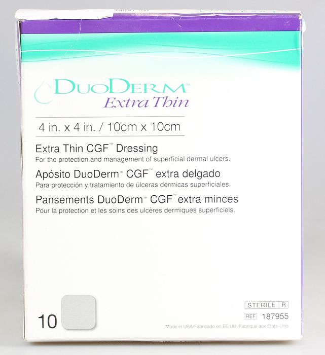 DuoDERM® Extra Thin CGF™ Dressing is a hydrocolloid dressing indicated for the management of lightly exuding wounds. It combines a unique ConvaTec hydrocolloid formulation that distinguishes it from other hydrocolloid dressings and a vapour-permeable outer film to provide an occlusive moist environment.