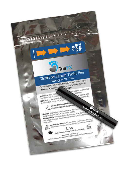 Sold in Packs of 10, each pen is sufficient for treating 10 toes and each pack covers the length of a complete treatment plan of 10 sessions for each patient. Begin by assesing the severity of the fungus and explain the process and the treatment plan to the patient. Debride affected nails as nessesary to break down fungal build up on the nail. Use 1 ClearToe Serum pen to thoroughly coat all 10 nails. Wait 10-15 minutes then place the patients feet under the ClearToe Therapy Lights for a further 15 minutes. The combination of the Serum and the Lights work together to destroy the fungal cells.